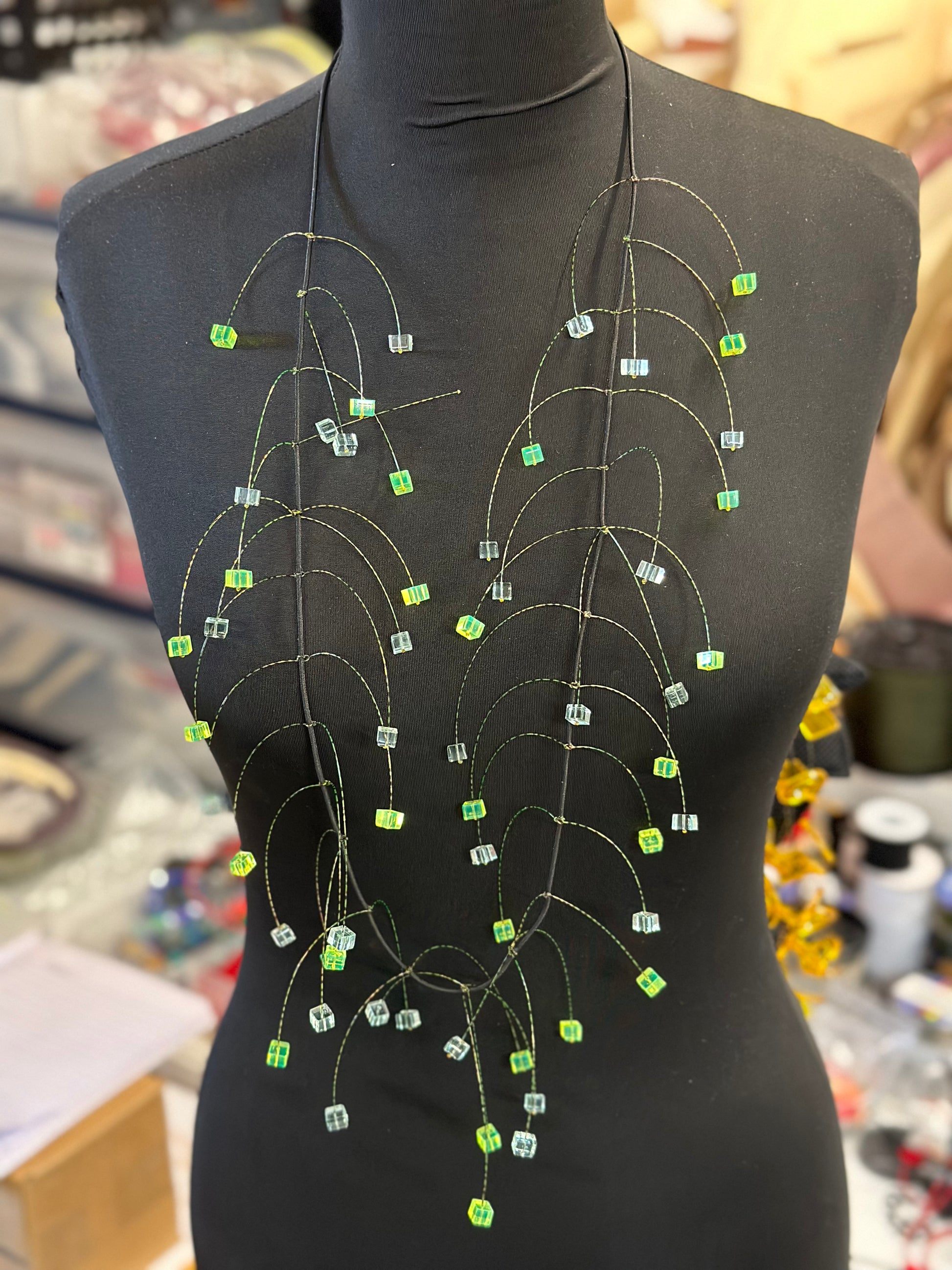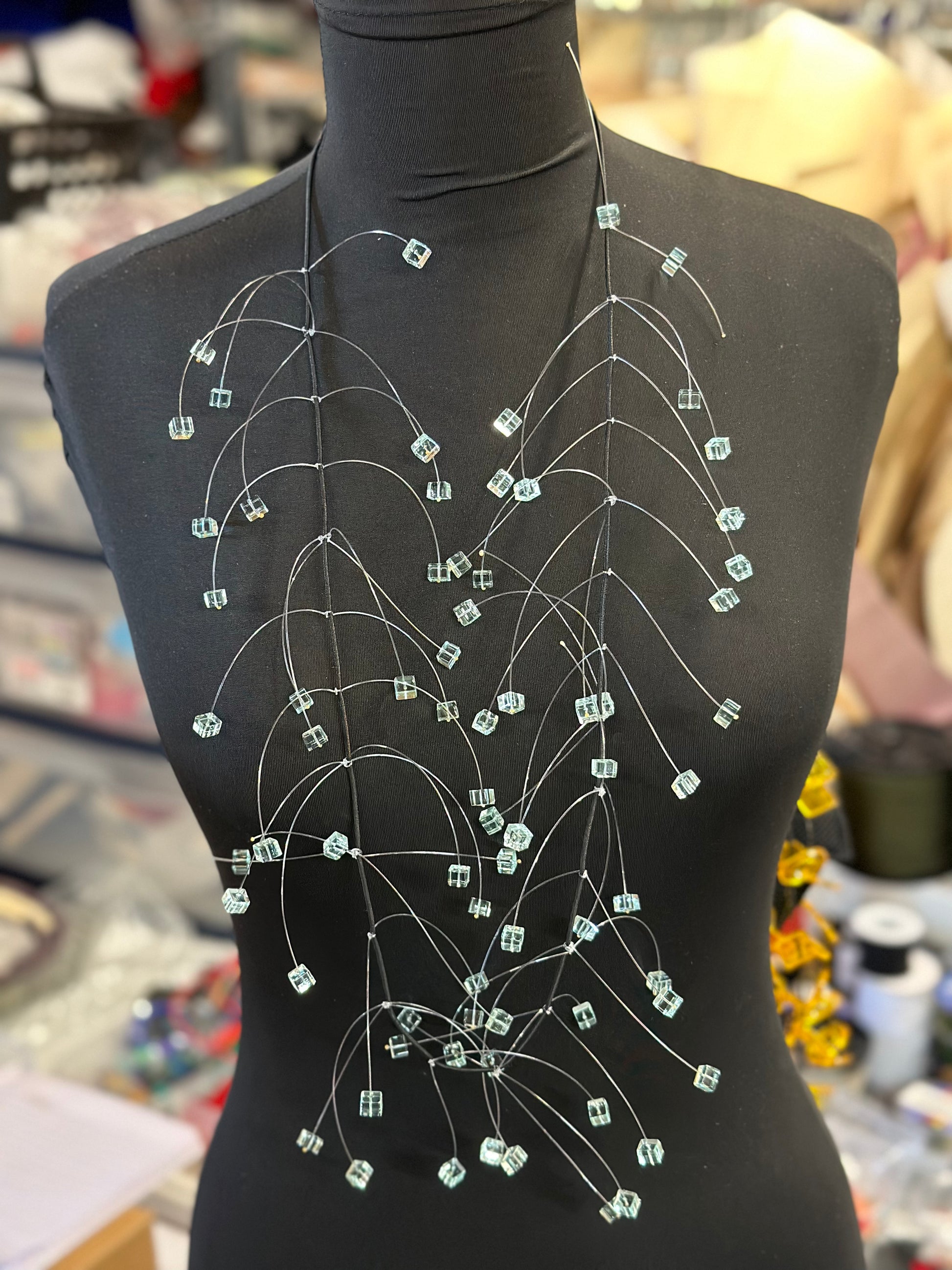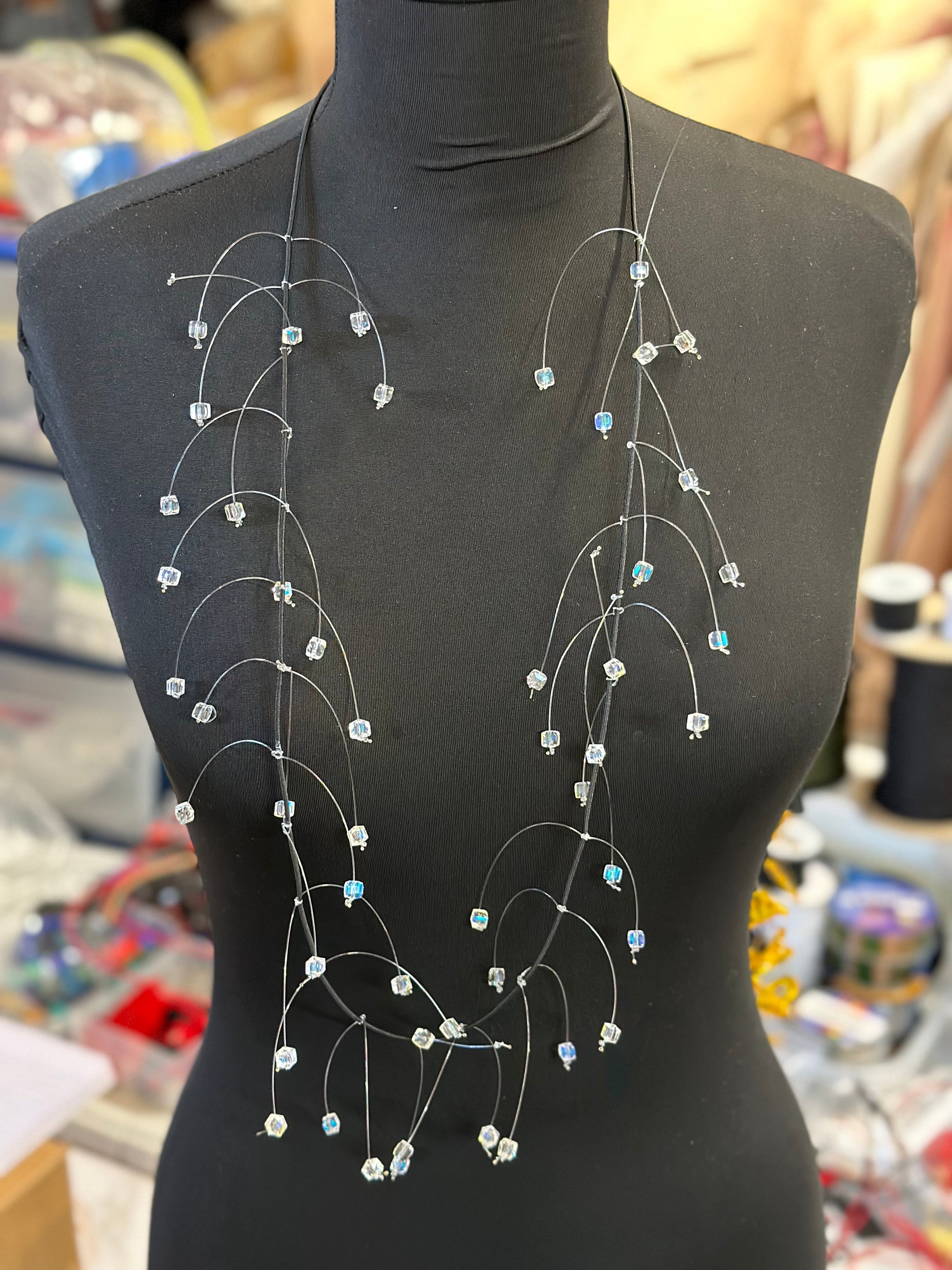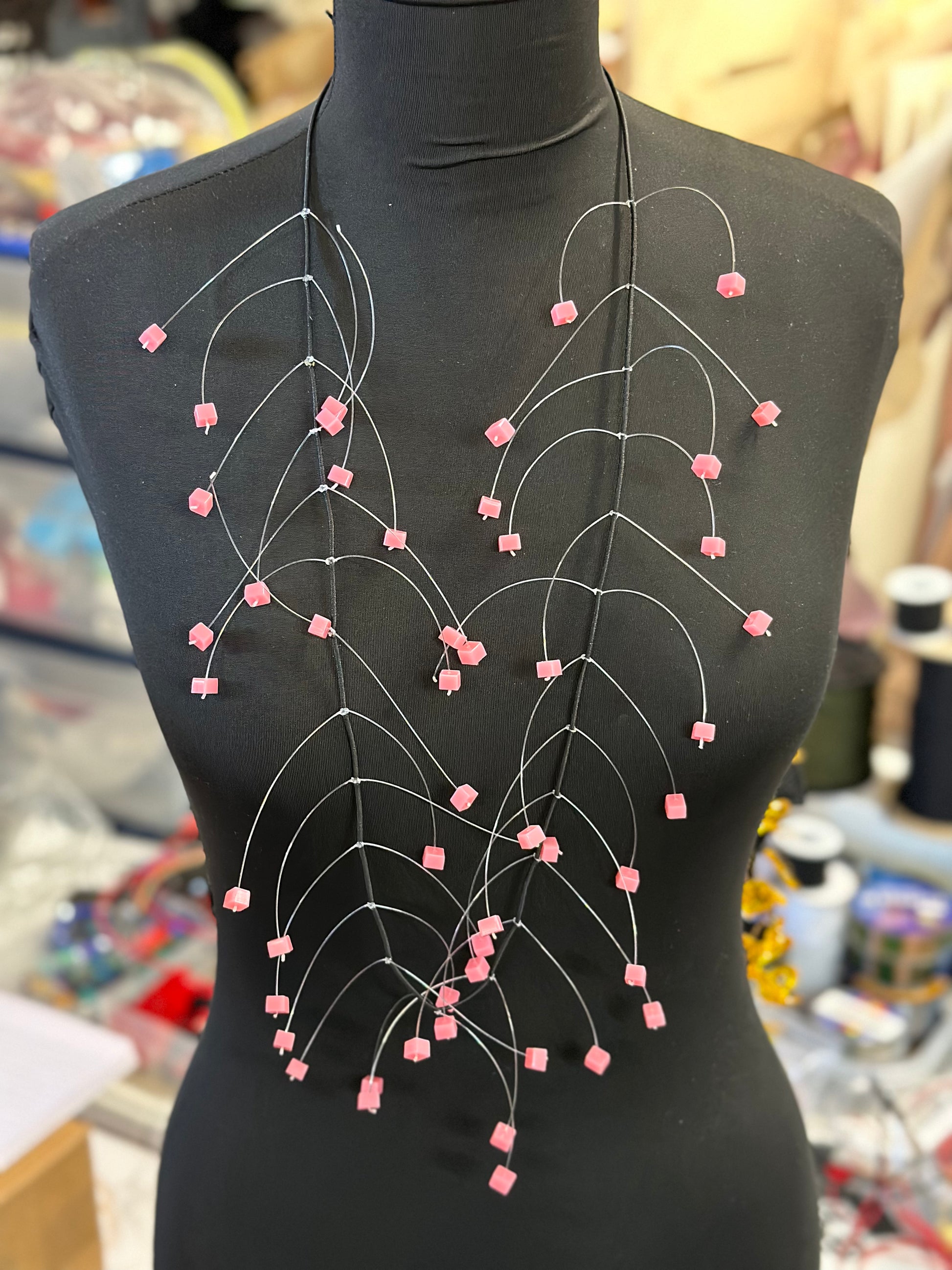 Boxy Drop Necklace 48” Long with single layer of lasercut beads. Designed and cut in our Chicago studio.